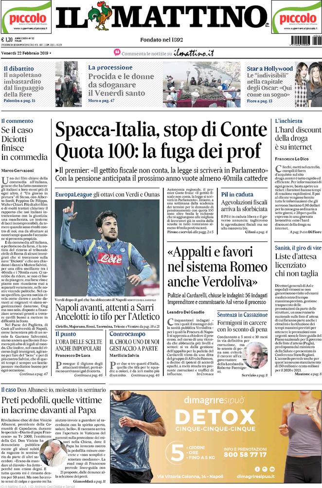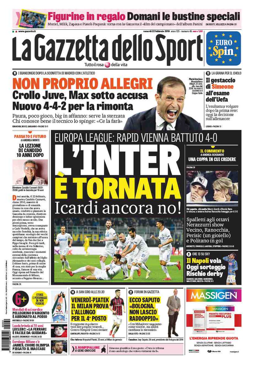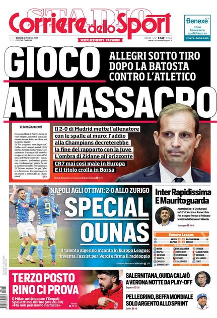 NewsCalcioIn Evidenza Rassegna stampa del 22 febbraio. Edicola sportiva nazionale By Giuseppe Sacco il Feb 22, 2019 - 07:20:11 0 Condividi Queste le pagine in primo piano oggi sui quotidiani sportivi nazionali Factory della Comunicazione RassegnaStampa 0 Condividi FacebookTwitterGoogle+ReddItWhatsAppPinterestE-mail