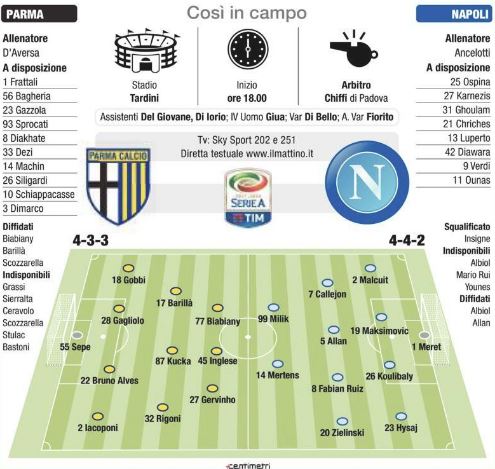 Ancelotti e D’Aversa confidano in una loro giocata decisiva oggi al Tardini: nel Napoli mancherà Insigne per squalifica a in attacco al fianco di Milik parte Mertens favorito su Ounas e Verdi, le altre due soluzioni per il ruolo di seconda punta. Inglese gioca al centro del tridente in mezzo alle due frecce Gervinho-Biabiany.