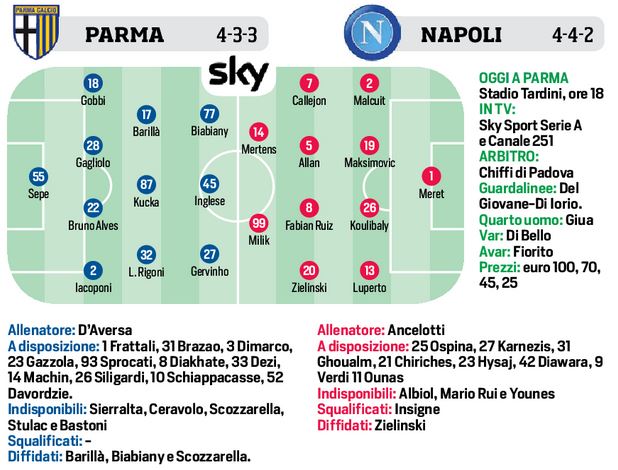 Oggi pomeriggio allo stadio “E. Tardini”, con fischio d’inizio alle ore 18,00, il Napoli cercherà i tre punti contro i padroni di casa del Parma per consolidare il secondo posto in classifica. Ancelotti, secondo il CdS, starebbe pensando di schierare come terzino sinistro Luperto, il classe ’96 parte favorito su Hysaj e Ghoulam. Per il resto la migliore formazione, ad eccezione dello squalificato Insigne, dove sembra Mertens in vantaggio su Ounas. Per i ducali invece è piena emergenza, assenti Bastoni, Stulac, Scozzarella e Ceravolo per infortunio. In avanti Gervinho, Inglese e Biabiany.