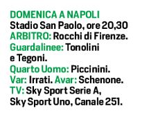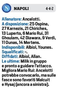Domenica sera alle ore 20,30 allo stadio San Paolo si giocherà il big-match Napoli-Juventus per la settima di ritorno. Il tecnico degli azzurri Carlo Ancelotti ha due dubbi di formazione. Il primo sulla fascia sinistra tra Hysaj e Ghoulam, con l’ex Empoli in vantaggio su Ghoulam. L’altro è in attacco con Milik che dovrebbe spuntarla su Mertens, visto che il polacco ha recuperato dalla botta presa nei giorni scorsi per affiancare Insigne. In casa bianconera Cr7 tiene in apprensione Allegri, ieri però il portoghese si è allenato in gruppo. Secondo il Corriere dello Sport, la sensazione è che potrebbe partire dalla panchina, con Dybala al centro dell’attacco, Mandzukic e Bernardeschi sulle corsie offensive. Emre Can in vantaggio su Bentancur e Cancelo su De Sciglio.