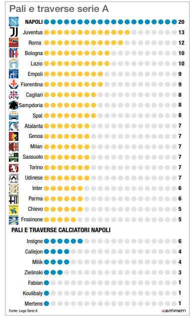 Sono già 20 le circostanze in cui un calciatore del Napoli ha fatto tremare un palo o una traversa e sono sensibilmente più staccate tutte le altre formazioni della serie A
