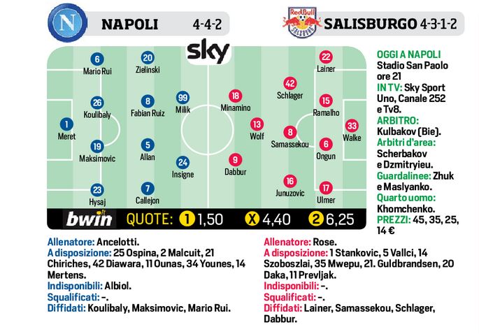 Questa sera allo stadio San Paolo, fischio d’inizio alle ore 21,00, si giocherà la gara d’andata degli ottavi di finale di Europa League tra il Napoli e l’Austria Salisburgo. Il tecnico degli azzurri Carlo Ancelotti manderà in campo quasi la stessa formazione di domenica sera contro la Juventus con due cambi, Hysaj a destra e Mario Rui a sinistra. Per il resto in attacco Insigne favorito per affiancare Milik. In casa austriaca invece probabile il recupero di Lainer come terzino destro, mentre in attacco spazio al giapponese Minamino con Dabbur in avanti per il 4-3-1-2.