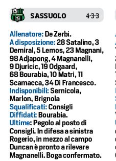 Domenica pomeriggio al “Mapei Stadium” alle ore 18,00 il Napoli di mister Carlo Ancelotti affronterà i padroni di casa del Sassuolo per l’ottava di ritorno. I neroverdi di Roberto De Zerbi dovranno fare a meno dello squalificato Consigli e degli infortunati Marlon e Brignola. In attacco Berardi, Babacar e Boga, mentre dovrebbero recuperare Peluso e Sensi. In casa azzurra spazio sulle fasce a Malcuit e Ghoulam, mentre in attacco lotta a tre per due maglie per Insigne, Mertens e Milik