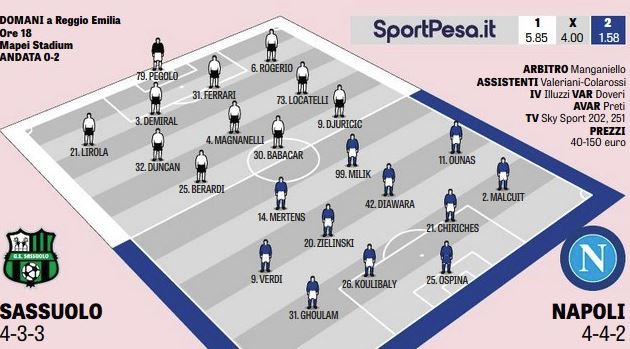 La Gazzetta dello sport pubblica le probabili formazione della sfida di domenica tra Sassuolo e Napoli.