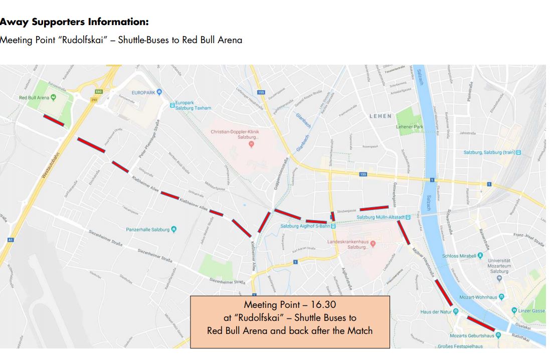 Per i sostenitori del Napoli è stato organizzato un meeting point. Il punto di incontro è a “Rudolfskai”, nel centro storico; gli Shuttle Bus porteranno i fan direttamente alla Red Bull Arena e torneranno dopo la partita.