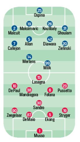 [grafico] Napoli/Udinese, Ancelotti si gioca la carta Ghoulam a sinistra. Nicola con l’unica punta Lasagna