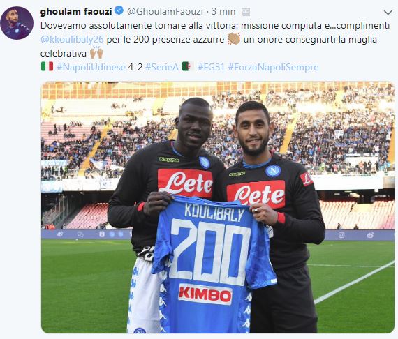 Ghoulam su twitter:”Dovevamo assolutamente tornare alla vittoria: missione compiuta e…complimenti a KK per le 200 presenze azzurre un onore consegnarti la maglia celebrativa”