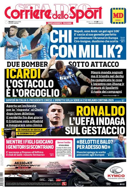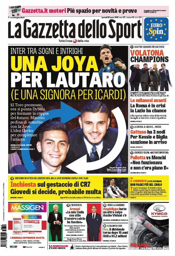 NewsCalcioIn Evidenza Rassegna stampa del 19 marzo – Edicola delle prime pagine sportive nazionali By Giuseppe Sacco il Mar 19, 2019 - 07:40:11 0 Condividi Oggi in primo piano sui quotidiani sportivi Factory della Comunicazione èagineEdiclaprimeSportiva 0 Condividi FacebookTwitterGoogle+ReddItWhatsAppPinterestE-mail