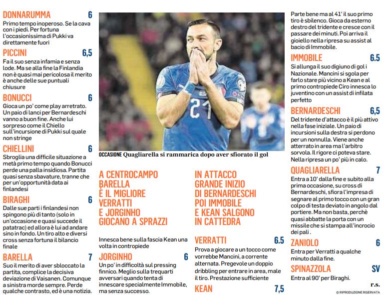 Il Mattino dà i voti all’Italia: ottimi i due napoletani. Mancini soddisfatto