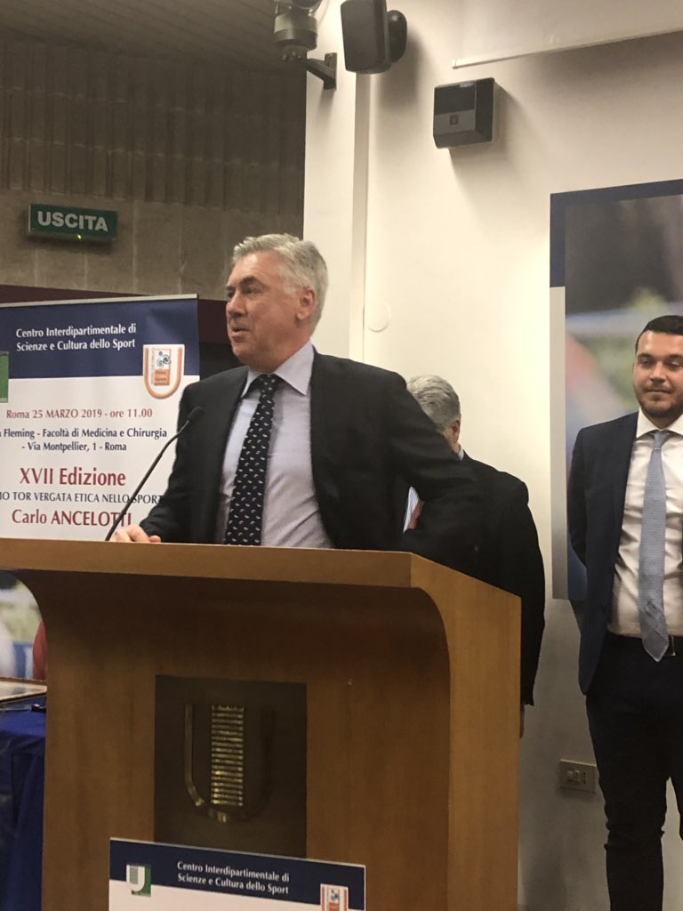 l’universo che si specchia negli occhi di Ancelotti è un micro (macro) cosmo giovanile che sembra rapito dal suono delle parole, dalle espressioni lievi, da quel senso di serenità esteriore che si propaga all’Università di Tor Vergata. E vabbè, c’è pure quella gioielleria che luccica, ma stavolta, mentre intorno c’è un silenzio quasi surreale che “naturalmente” in duecento creano a mo’ d’atmosfera religiosa, invidiati da altri quattrocento alunni che avrebbero voluto essere lì, nell’aula Fleming, quel che brilla sono gli occhi espressivi di Carlo Ancelotti, la sua maestosa semplicità e pure quella sciccosa, si direbbe regale, eleganza che gli è valsa (anche) il diciassettesimo premio “Etica dello Sport”.