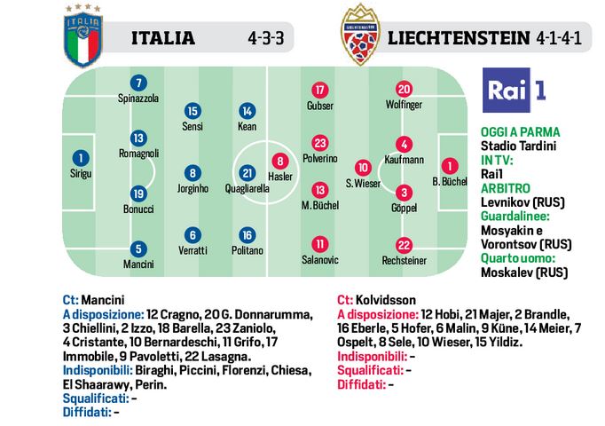Questa sera allo stadio “E. Tardini” di Parma, con fischio d’inizio alle ore 20,45, l’Italia del c.t. Roberto Mancini punterà al secondo successo nel girone contro il Liechtenstein e vincere con un ampio punteggio per la differenza reti. In attacco spazio a Quagliarella, Politano e al classe 2000 Kean. Per il resto le altre novità saranno Sirigu in porta, Romagnoli, Mancini e Spinazzola in difesa e Sensi a centrocampo. La squadra ospite giocherà con il 4-1-4-1, tanta difesa per evitare una goleada e provare ogni tanto delle ripartenze.