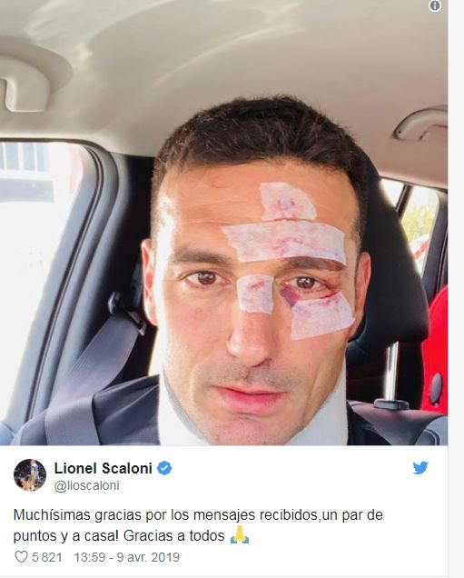 L’argentino Lionel Scaloni, che è stato investito da un’auto, ha pubblicato una foto della sua faccia ferita durante la sua caduta.