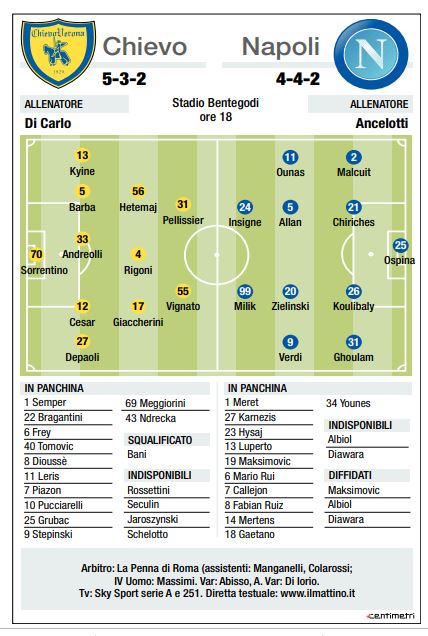 Chievo/Napoli: il capitano da subito, nuova difesa per Verona (grafico)