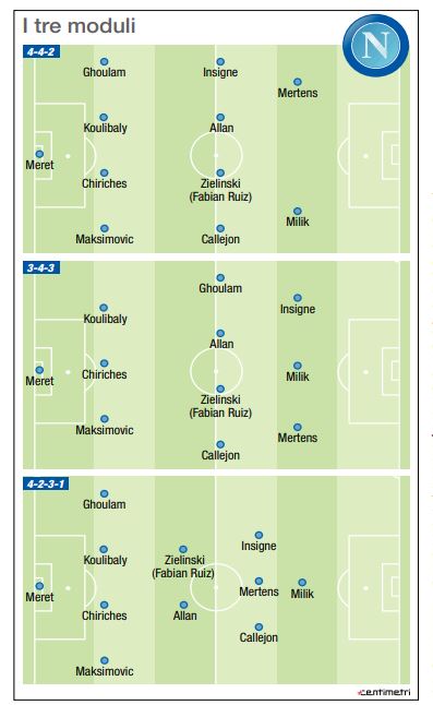 Con la conferma della formula con tre centrali difensivi e cioè Maksimovic, Chiriches e Koulibaly il Napoli potrà attaccare maggiormente sulle fasce con Callejon e Ghoulam che partiranno più alti in fase di spinta. La formula Champions che Ancelotti intende riproporre nel retour match dei quarti di finale di Europa League contro l’Arsenal, sperimentata contro il Chievo Verona: in fase difensiva il Napoli resta con l’assetto del 4-4-2, in quella offensiva restano bloccati i tre difensori per contrastare le eventuali ripartenze dei Gunners e gli azzurri attaccheranno con il 3-4-3 con i due esterni che potranno stringersi vicino a Milik, una via di mezzo è il 4-2-3-1 (e il 3-4-2-1). Tante soluzioni, insomma, Ancelotti punta innanzitutto sull’imprevedibilità per sorprendere la disposizione difensiva dell’Arsenal: movimenti continui e giocate nello stretto. Una strategia che prevede più soluzioni con la presenza certa di Milik al centro dell’attacco, il capocannoniere stagionale del Napoli con 20 reti, la cui fisicità è mancata nella sfida di Londra.