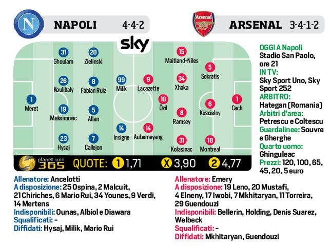 Questa sera allo stadio San Paolo, con fischio d’inizio alle ore 21,00, il Napoli tenterà la rimonta, dopo il 2-0 subito all’Emirates Stadium contro l’Arsenal. Per farlo Carlo Ancelotti potrà contare sul duo Milik-Insigne in attacco. I ballottaggi per il tecnico degli azzurri saranno in difesa con Mario Rui o Ghoulam sul lato sinistro, l’algerino sembra avere la meglio, o Malcuit-Hysaj a destra. Per Emery invece c’è il recupero dello svizzero Xakha a centrocampo, mentre l’attacco sarà composto da Ozil, Aubamayang e Lacazette.