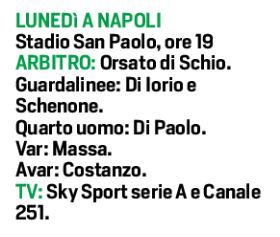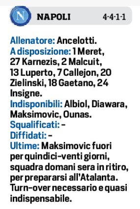 Lunedì di Pasquetta allo stadio San Paolo, con fischio d’inizio alle ore 19,00, tra il Napoli e l’Atalanta, per la tredicesima di ritorno. Gli azzurri hanno voglia di rivalsa dopo la sconfitta di Europa League contro l’Arsenal e per farlo faranno uso di turnover. A cominciare dal portiere che sarà Ospina al posto di Meret. Sulle fasce spazio a Malcuit e Mario Rui. A centrocampo turno di riposo per Callejon e Zielinski, in luogo di Verdi e Younes. Dubbio sul partner di Milik, probabilmente sarà Mertens in luogo di Insigne. Per gli orobici dubbio Ilicic ancora non al meglio, solo oggi se ne saprà di più.