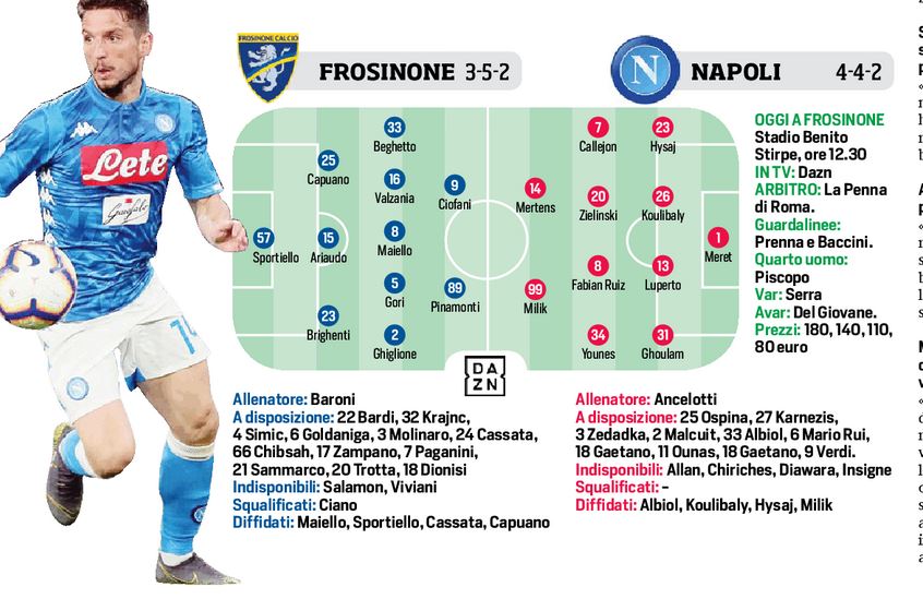 Frosinone/Napoli [Grafico] Ancelotti manda in campo Younes, padroni di casa con i cerotti