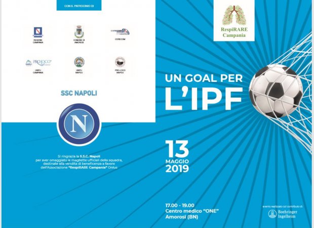 Amorosi, 3 maggio 2019. Lunedì 13 maggio, alle ore 17, presso il centro medico “ONE” di Amorosi (BN) del Prof. Alfonso de Nicola, responsabile dello staff medico della SSC Napoli, avrà luogo l’evento benefico UN GOAL PER L’IPF, organizzato dall’Associazione Pazienti “RespiRARE Campania Onlus”, in partnership con la SSC Napoli, realizzato con il contributo non condizionato di Boehringer Ingelheim. Scopo del convegno è la promozione di campagne di sensibilizzazione e raccolta fondi per il supporto psicologico ed economico a pazienti affetti da Fibrosi Polmonare Idiopatica (IPF), una rara patologia che colpisce i polmoni di cui soffrono 150.000 persone in Italia, 1500 delle quali in Campania. Ad essere colpiti sono soprattutto gli uomini sopra i 60 anni ma la sua diffusione è in aumento perchè è una patologia ancora oggi sottodiagnosticata. L’unica speranza di guarigione è il trapianto dei polmoni che si può però effettuare solo in alcuni casi e in pochi centri in Italia.