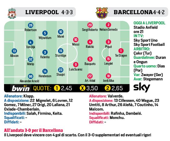 Il Liverpool è chiamato all’impresa dopo il 3 a 0 subito a Barcellona. Queste le possibili formazioni: