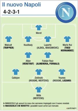 A Ferrara alle spalle di Milik, punta più avanzata, hanno giocato tre mezzepunte: Callejon a destra, Zielinski centrale e Younes a sinistra. Per l’anno prossimo resta sicuro del posto lo spagnolo con un’alternativa da cercare tra quelli in rosa o tra i possibili arrivi, da trequartista centrale ha giocato