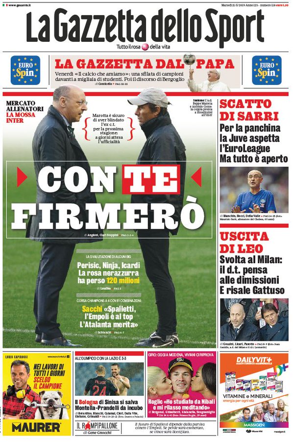 NewsCalcioIn Evidenza Rassegna stampa del 21 maggio. Edicola sportiva nazionale By Giuseppe Sacco il Mag 21, 2019 - 08:00:35 0 Condividi Queste le prime pagine di oggi Factory della Comunicazione RassegnaStampa 0 Condividi FacebookTwitterGoogle+ReddItWhatsAppPinterestE-mail