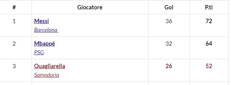 NewsCalcio Scarpa d’oro 2019 – Sprint finale fra Messi e Mbappé. Quagliarella sul “podio” e Ronaldo out By Giuseppe Sacco il Mag 21, 2019 - 15:20:07 0 Condividi Il napoletano Quagliarella sul podio, al 5°posto l’ex Zapata. Ronaldo solo 12° Factory della Comunicazione OroQuaglairellaScarpa 0 Condividi FacebookTwitterGoogle+ReddItWhatsAppPinterestE-mail