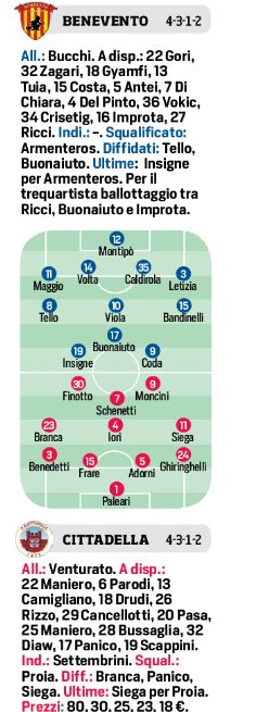 Cos’ in campo le due squadre secondo il Cds