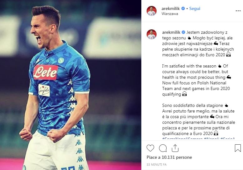 Milik, l’attaccante del Napoli e della Polonia, su Instagram, analizza la sua stagione con la maglia azzurra e si proietta verso le gare di qualificazione. “Sono soddisfatto della stagione ? Avrei potuto fare meglio, ma la salute è la cosa più importante ? Ora mi concentro pienamente sulla nazionale polacca e per le prossime partite di qualificazione a Euro 2020″.