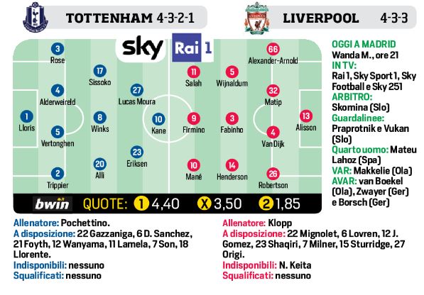 Firmino c’è e dovrebbe partire tra i titolari. Klopp ha recuperato l’attaccante brasiliano, tornato a lavorare nella settimana di ritiro spagnolo a Marbella dopo la lesione all’inguine riportata nei primi minuti dell’andata della semifinale con il Barcellona dello scorso primo maggio. L’unico assente certo è Naby Keita, fuori dai giochi per una lesione all’adduttore. Due degli eroi di Anfield contro il Barça difficilmente partiranno tra i titolari: per Shaqiri e Origi potrà esserci spazio solo a partita in corso. In difesa dubbi non ci sono. Ballottaggio a centrocampo tra Wijnaldum e Milner, con l’olandese favorito. Ieri durante la rifinitura al Wanda Metropolitano Klopp ha mischiato le carte nella partitella a campo ridotto, mettendo di fronte Salah e Mané. I due, però, questa sera partiranno entrambi titolari ai lati di Firmino.