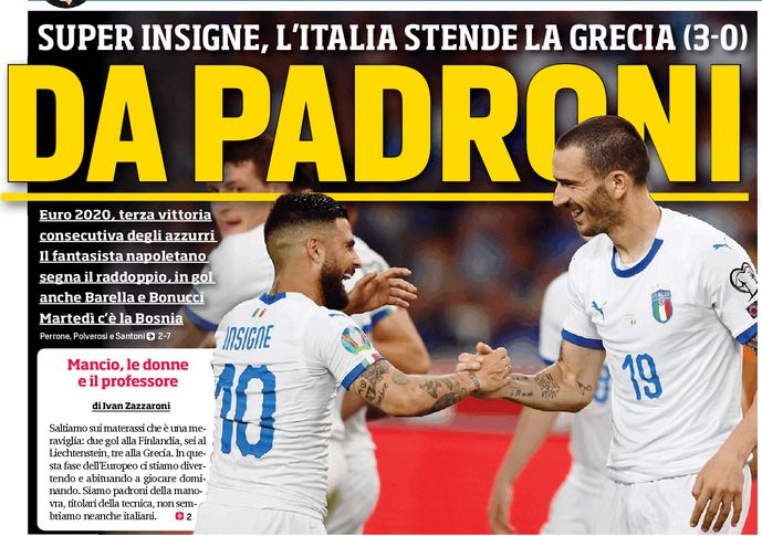 Tutto facile per gli Azzurri di Roberto Mancini ad Atene, terza vittoria in altrettante gare sulla strada degli Europei 2020. Bastano 10 minuti nel primo tempo per superare la Grecia travolta dalle reti di Barella, Insigne e Bonucci. Italia che vola a 9 punti nel gruppo J in attesa della sfida di martedì a Torino contro la Bosnia, battuta 2-0 dalla Finlandia.