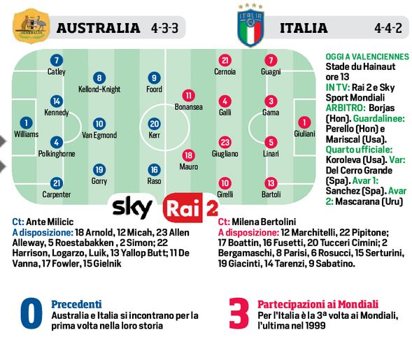 Basta attese, basta parole, basta tutto, vogliono giocare, vedere, emozionare: «E’ la vigilia più attesa – dice la capitana Sara Gama – e abbiamo voglia di affrontare la competizione che ogni calciatrice sogna fin da piccola. Siamo serene, anche se non eravamo abituate a tutta questa attenzione. Se l’Australia ci teme vuol dire che abbiamo lavorato bene. Siamo consapevoli della nostra crescita. Ma dobbiamo scendere in campo con umiltà. Sappiamo che dobbiamo rimanere fedeli al campo e ai nostri valori e con i piedi per terra, ma ci godiamo il momento. Ci divertiremo in campo e lottiamo per onorare la maglia fino alla fine. Vogliamo trasmettere grosse emozioni agli italiani». Il c.t. Milena Bertolini per quanto riguarda la formazione punterà sul duo d’attacco Ilaria Mauro e Barbara Bonansea, mentre a centrocampo spazio sulle corsie esterne a Girelli e Cernoia, mentre nella linea mediana la “napoletana” Giugliano con Aurora Galli. Per le australiane occhio all’attaccante Kerr.