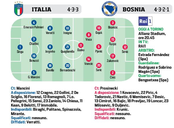 Questa sera all’Allianz Stadium di Torino si gioca la quarta gara di qualificazione ai prossimi Europei 2020 tra l’Italia e la Bosnia. Il c.t. Mancini cerca un altro successo per allungare in classifica e per farlo, come riporta il CdS, manderà in campo il tridente composto da Insigne, Quagliarella e Bernardeshi. A centrocampo l’ex Napoli Jorginho con Barrella e Verratti ai lati. In difesa il duo Chiellini e Bonucci. Gli ospiti avranno tre conoscenze del calcio italiano: Zukanovic in difesa, Pjanic a centrocampo e Dzeko in attacco.