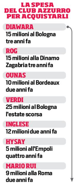 Amadou Diawara (arrivato dal Bologna per 15 milioni); Elseid Hysaj (5 all’Empoli); Roberto Inglese (12 al Chievo); Adam Ounas (10 al Bordeaux); Marko Rog (15 alla Dinamo Zagabria); Maio Rui (9 alla Roma); Simone Verdi (25 al Bologna)