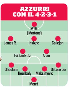può valutare sia il 4-4-2 (schierandolo esterno o dietro la punta); sia il 4-3-3 (a destra o sinistra); sia il 4-2-3-1: Callejon, James e Insigne alle spalle di Arek o Dries. Modello Real o Bayern.