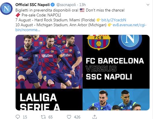 NewsCalcioRassegna Stampa UFFICIALE – Scatta la prevendita dei biglietti Barcellona/Napoli By Giuseppe Sacco il Giu 25, 2019 - 22:09:52 0 Condividi Per effettuare l’acquisto dei biglietti di Barcellona/Napoli collegarsi qui Factory della Comunicazione e qui BarcellonaBigliettiNapoli 0 Condividi FacebookTwitterGoogle+ReddItWhatsAppPinterestE-mail