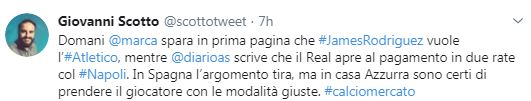 “Domani (oggi n.d.r)Marca spara in prima pagina che James Rodriguez vuole l’ Atletico, mentre Diario As scrive che il Real apre al pagamento in due rate col Napoli. In Spagna l’argomento tira, ma in casa Azzurra sono certi di prendere il giocatore con le modalità giuste”.