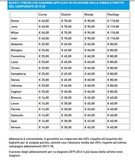 NewsCalcio Gara per gara, tutti i prezzi di ogni partita del campionato azzurro 2019/20 By Giuseppe Sacco il Lug 23, 2019 - 22:00:06 0 Condividi Per la prima volta sono disponibili tutti i prezzi dei biglietti per ogni gara ed ogni settore. Factory della Comunicazione GaraprezziSettore 0 Condividi FacebookTwitterGoogle+ReddItWhatsAppPinterestE-mail