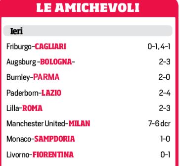 Tre italiane su cinque ieri hanno perso in amichevole, il Parma contro il Burley, la Sampdoria contro il Monaco e il Milan ai calci di rigore contro il Manchester United a Cardiff per la ICC. Per il resto il Cagliari continua il suo buon pre campionato e il Bologna prepara la stagione con un ottima vittoria contro l’Ausburg, la Roma vince di misura 3-2 contro il Lille orfano di Pepé e Leao, mentre la Fiorentina di Montella riesce a vincere contro il Livorno solo 1-0 grazie a Sottil.