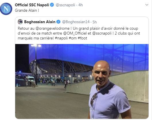 Il Napoli ieri sera ha battuto l’Olimpique Marsiglia al Velodrome, per 0-1, gol di Dries Mertens. Presente anche l’ex giocatore azzurro Alain Boghossian, che ha twittato così.
