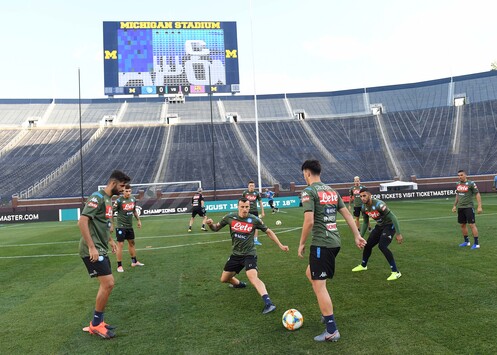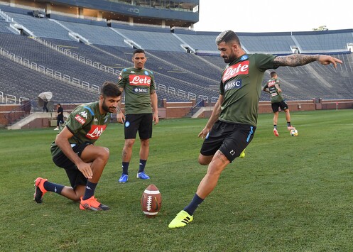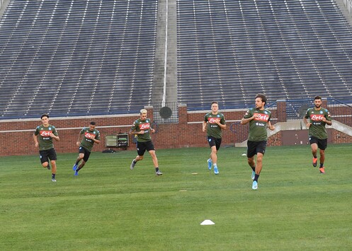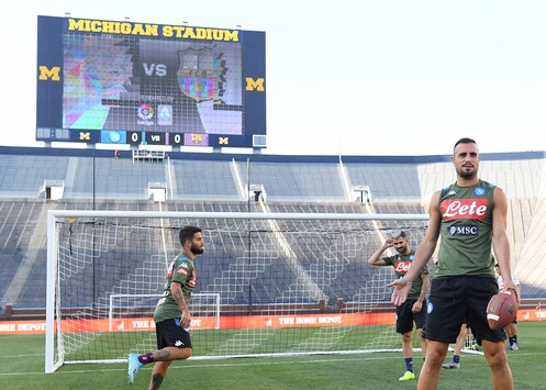Allenamento serale per il Napoli ad Ann Arbor. Gli azzurri domani affronteranno il Barcellona nel secondo test americano al “Michigan Stadium”4 (ore 23 italiane). Prima di iniziare la seduta, gli azzurri si sono cimentati in qualche tiro con la “palla ovale” per assaporare il clima dello stadio che è solitamente scenario della squadra di football americano dei Michigan Wolverine.La squadra ha poi avviato la sessione con una prima fase di riscaldamento a secco.Successivamente lavoro finalizzato alla reattività. Chiusura con partitina a campo ridotto ed esercitazioni al tiro.Differenziato per Younes.Malcuit e Tonelli proseguono il loro lavoro personalizzato al Centro Tecnico di Castelvolturno.