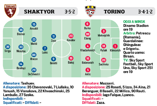 Ore 19,00 -EL: Shakhtyor Soligorsk/Torino, le possibili formazioni