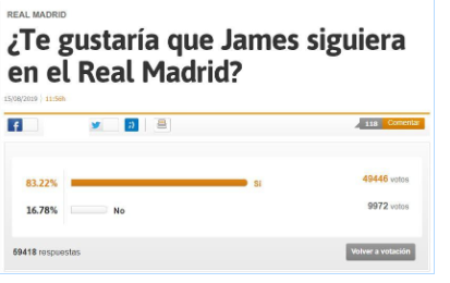 E’ aperto l’affare che lo porterebbe al Napoli, ma i tifosi della Casa Blanca preferirebbe che il colombiano restasse. E’ questo il risultato del sondaggio del quotidiano As (83% è per la sua permanenza al Real)