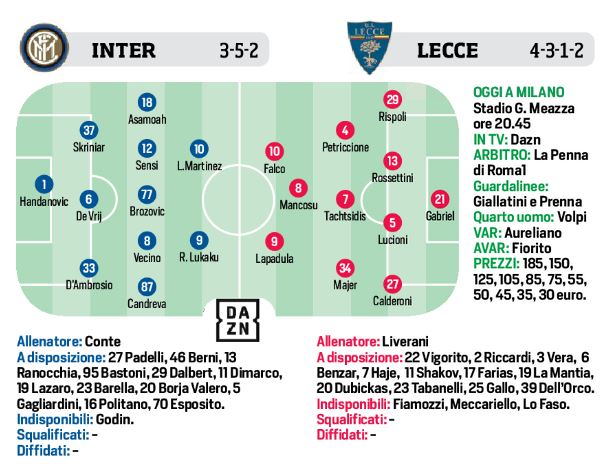 NewsCalcio Ore 20,45 – Inter/Lecce le probabili formazioni del CdS By Giuseppe Sacco il Ago 26, 2019 - 18:20:22 0 Condividi Inter e Lecce così potrebbero scendere in campo tra poche ore Factory della Comunicazione FormazioniInterLec ce 0 Condividi FacebookTwitterGoogle+ReddItWhatsAppPinterestE-mail
