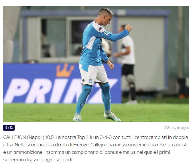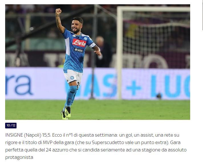 Prima giornata di campionato, prima classifica dei migliori. La Top 11 è stata stilata da Sky e dopo la scoppiettante vittoria di Firenze, sono due gli azzurri in questo speciale elenco. Insigne e Callejon, ovvero la premiata ditta, lo zoccolo dure del Napoli, il sinonimo di continuità. Il capitano azzurro è anche il numero uno della settimana!