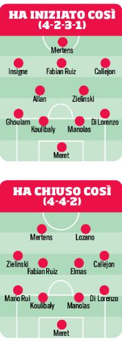 Ancelotti stavolta interviene nell’intervallo: dentro Mario Rui per Ghoulam (che è anche ammonito e quindi rischia), poi Lozano per Insigne (che sta male ma che non incide), con Zielinski che finisce largo a sinistra e con Callejon a destra.