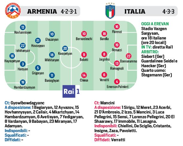 Q. Europei: Armenia-Italia. Solo un ex Napoli nella probabile formazione