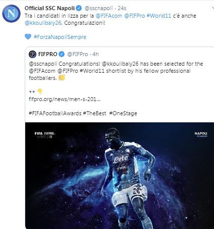 Tra i candidati in lizza per la FIFAcom FIFPro World11 c’è anche K Koulibaly26 il difensore del Napoli. Congratulazioni!