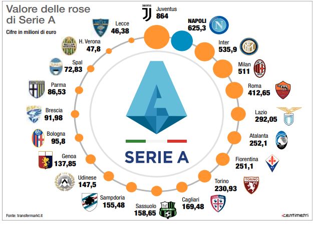 I parametri di valutazione di Transfermark per le Società. Il Napoli ha sfondato i 600 milioni