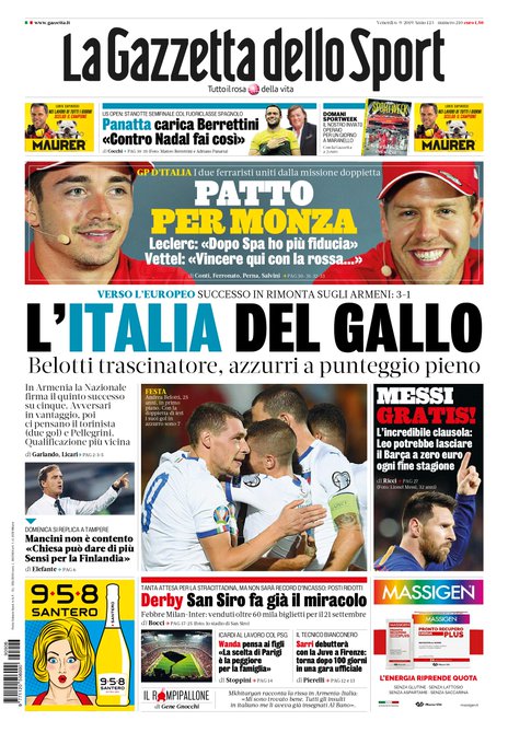 NewsCalcioIn Evidenza Rassegna stampa del 6 settembre. Edicola sportiva nazionale By Giuseppe Sacco il Set 6, 2019 - 07:40:11 0 Condividi In primo piano dai principali quotidiani sportivi Factory della Comunicazione RassegnaStampa 0 Condividi FacebookTwitterGoogle+ReddItWhatsAppPinterestE-mail