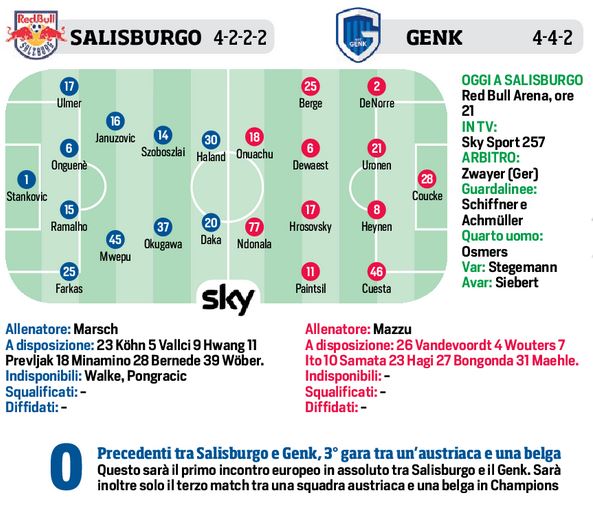 Così come alle 21 si sfideranno Napoli e Liverpool, anche Salisburgo e Genk face to face. Così in campo secondo Il CDS